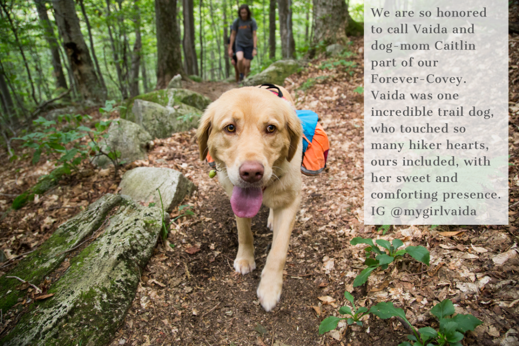 when vaida was on overnight backpacking adventures she had her own custom fitted harness and saddlebag pack made by groundbird gear. vaida was one of the company’s first customers and soon became an ambassador and member of the covey. her pack had a custom color scheme of red, orange and blue. over the years these colors became known amongst friends and family members as “vaida colors”.